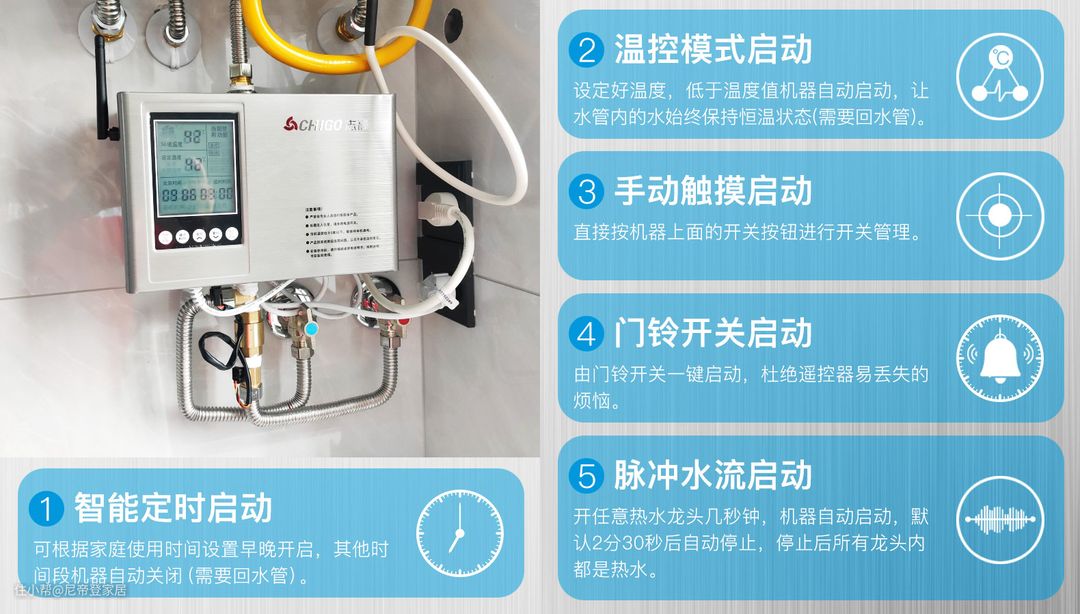 另外有人担心用回水器后,必须24小时开启,这样比较费钱,其实现在回水器或“零冷水”热水器都比较智能了,可以设置定时启动(需要走回水管),或温控模式启动(需要走回水管),或脉冲水流启动、手动启动、门铃开关启动等多种方式开启回水系统,这样就不用24小时开着浪费资源了。