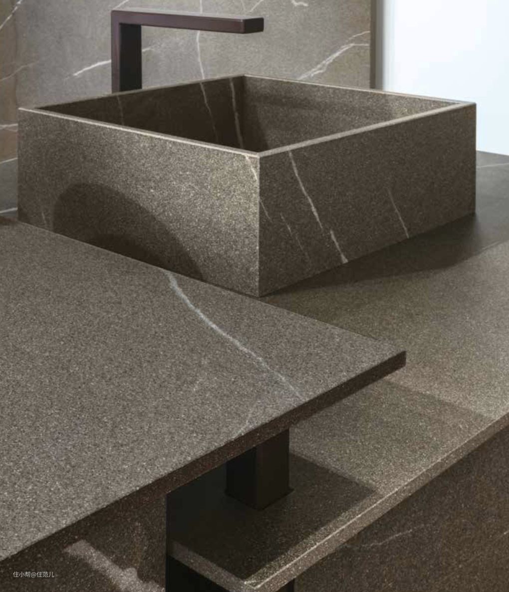 近几年的材料圈“新贵”岩板也很适合做浴室柜台面,好看,防水防污易清洁,环保性也更好。