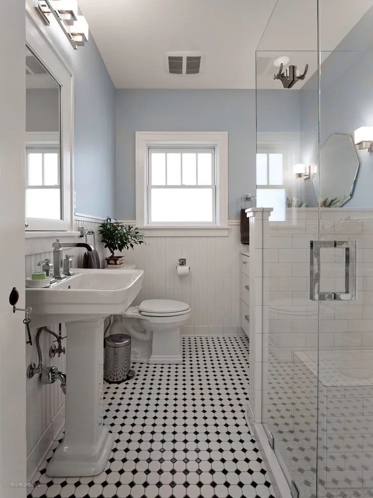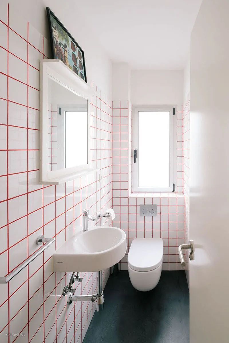 我们在欧洲很多家庭看到这样的洗手间:高脚台盆或者悬浮台盆,配个镜子,再加一个马桶和花洒,卫生间基础功能全部齐备。