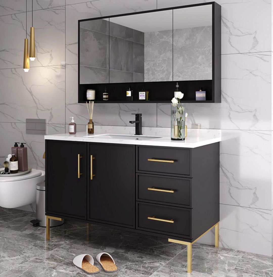黑色浴室柜大多是做轻奢风,配金色五金、细脚细框架、做金色线条装饰,乍一看确实精致。