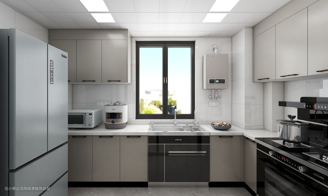 2、如果户型条件允许建议橱柜U型布局,可用台面长,方便按顺序布置洗、切、炒区域。