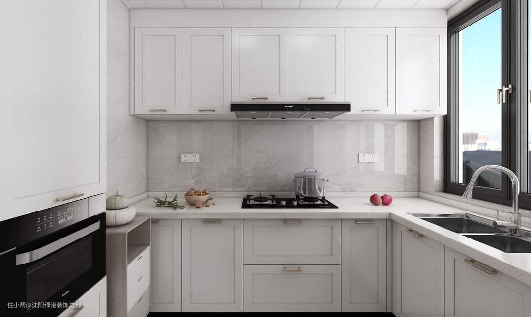 4、台面推荐石英石,白色台面颜色白搭,但可能会渗污,要注意及时清洁。