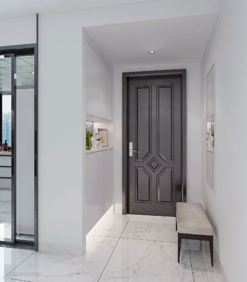 由于出门的鞋全是进了玄关才换,因而玄关是一个非常容易脏的空间,在玄关铺装亚光深灰色砖,能够让玄关更为简洁、耐用,又便于清洁。