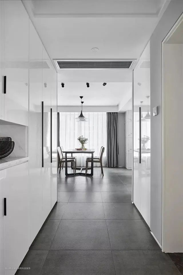 玄关、客厅、餐厅与过道等地区,在室内装饰设计中通称为“公共活动区域”,因而这一地区在地面设计方案上,就可以采用与客厅地面一致的地砖样式,让大全部区域维持风格上的统一。