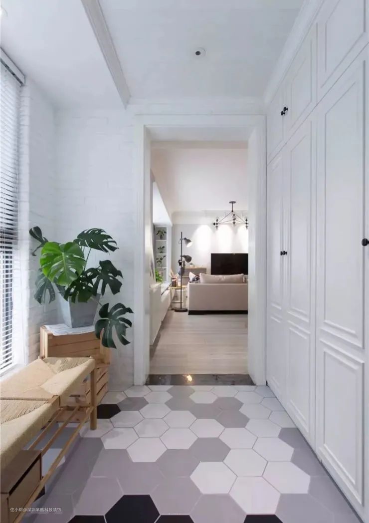 玄关是每一次进门处后的第一个空间,而许多房型的玄关全是一个走廊式的空间,根据精美的地砖样式配搭,能够让玄关的空间感更为文艺范儿,小资情调,令人一进门处就感受到一种雅致舒服的情调感。