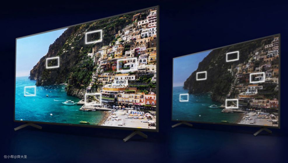 还可以把背光面板进行分区,将每个背光灯珠用方框物理隔离开来,使得画面上该亮的地方亮,不该亮的地方保持黑暗,更精准得控制画面不同区域的亮度,实现更高的画面对比度,更好的HDR效果。