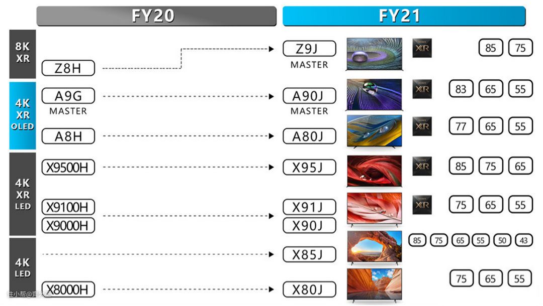 注:索尼4K液晶电视分80系列,85系列,90系列,95系列,数字越大越高级,价格越贵。以85系列为例,65X8500E,65指屏幕尺寸,而字母E为年款标识,8500E为17年上市,后续还有8500F/G/H。而21年上市的85系列则更改了命名规则,变更为X85J。