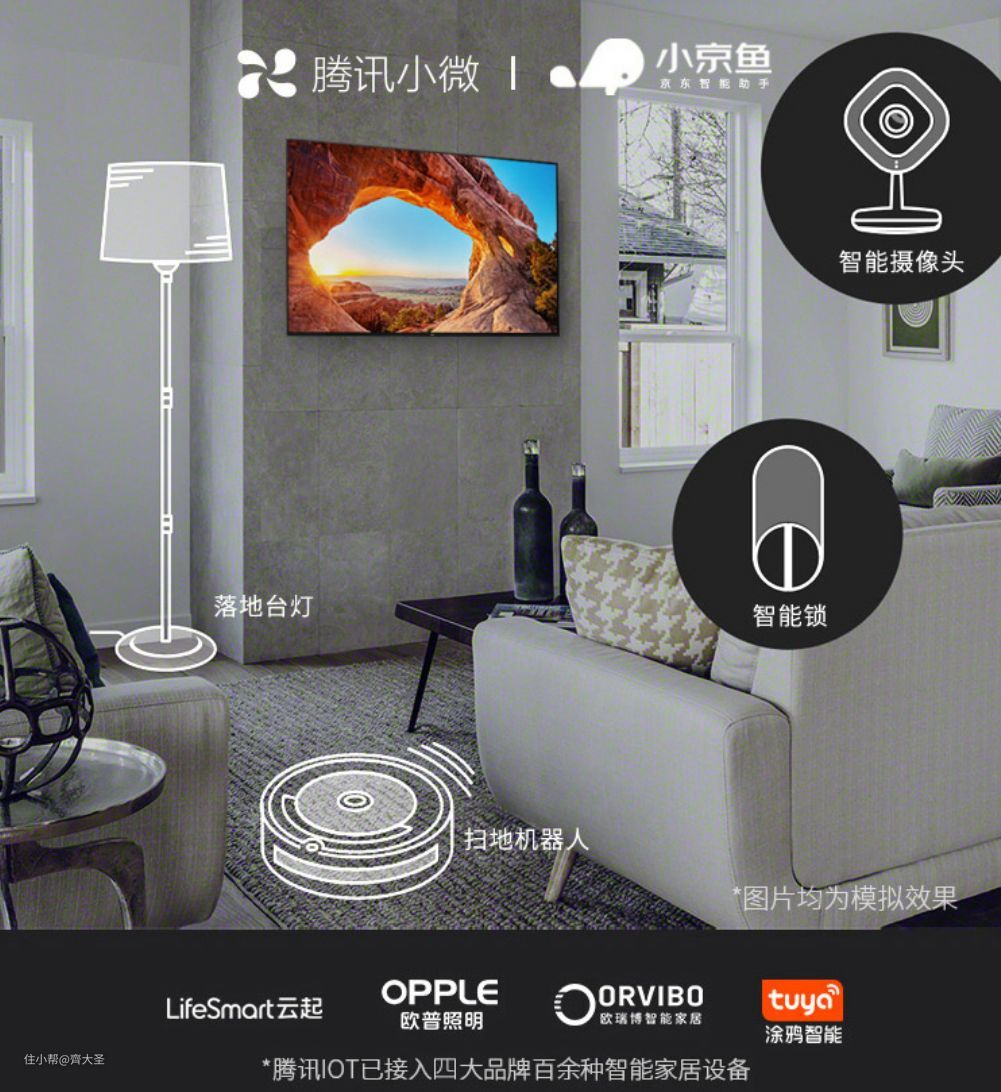 支持两大平台「腾讯小微」&「小京鱼」的AloT智能物联,可以通过电视的远场智能语音功能对联入的智能家电设备(如扫地机、空调、洗衣机等)进行语音控制,化身全屋智能家电的控制中枢。