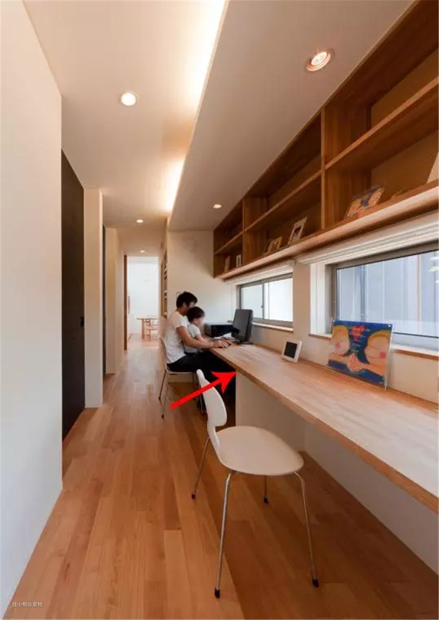 近几年很多室内设计中,也常常会把走廊的空间设置成小书房,一般都是利用内凹的墙面冗余空间,加入隔板架当作书桌,放上一张椅子,一个小小的书房区域就完成了!