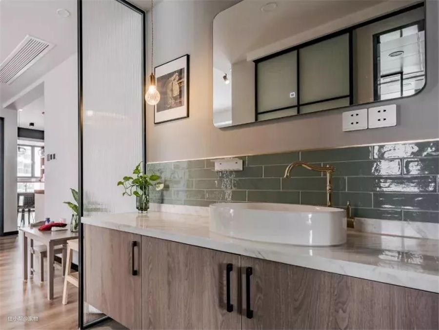 一般情况下大家很少这样做,但在某些特殊户型中, 把洗手池位移到走廊区域,既充分利用空间,又起到了干湿分离的作用,一不小心没准儿还能把卫生间做成三分离呢~