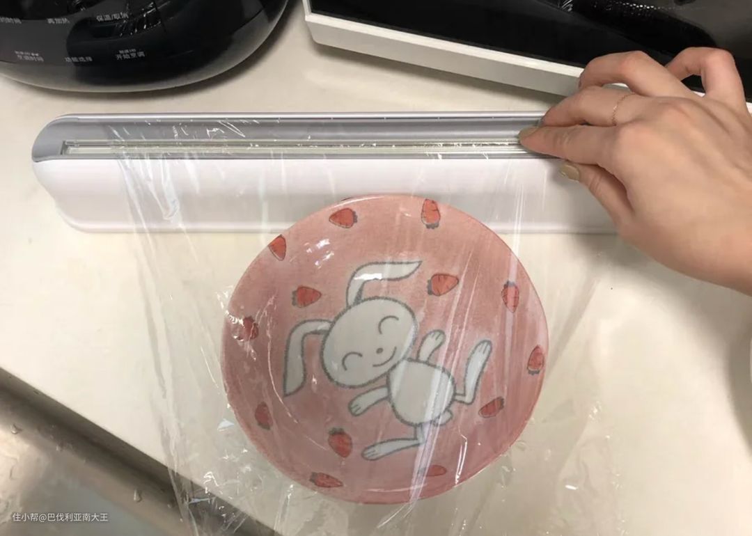 刀头是隐藏的,不用担心手指被切到,超市里卖的大部分保鲜膜都能放进去。使用方法很简单,只需要把保鲜膜放进切割器一拉、一切就整齐切开了。切完之后保鲜膜也不会回缩,会预留一小段方便下次使用。