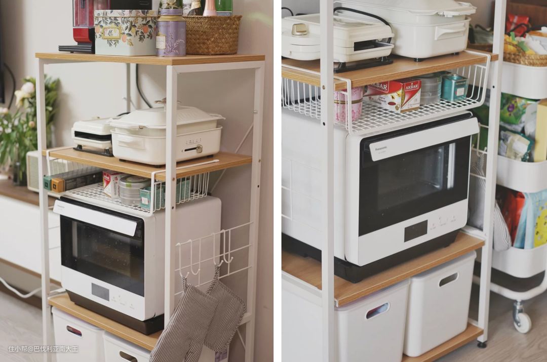 之前给大家安利厨房小家电时,总有值友问如何收纳它们,可以在冰箱旁的空余地方放置一个置物架,对小户型非常实用。这款是日式原木风,颜值赛高,隔板高度可调节,侧面还有两个挂钩,可以挂一些小杂物。中间可以再加装一层网格收纳架,充分利用空间,店铺里都有配套尺寸的~