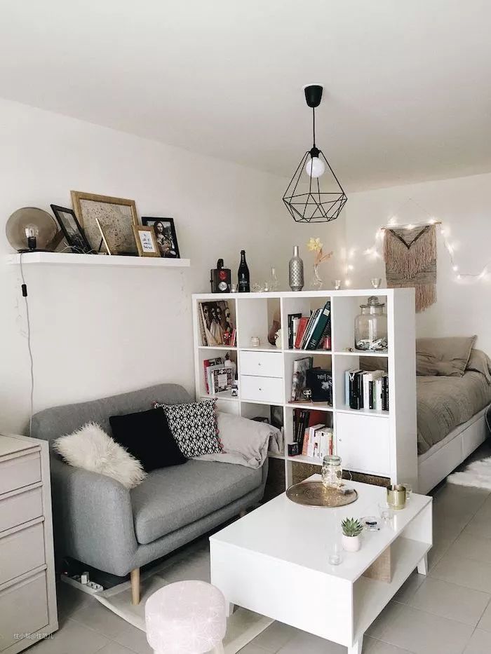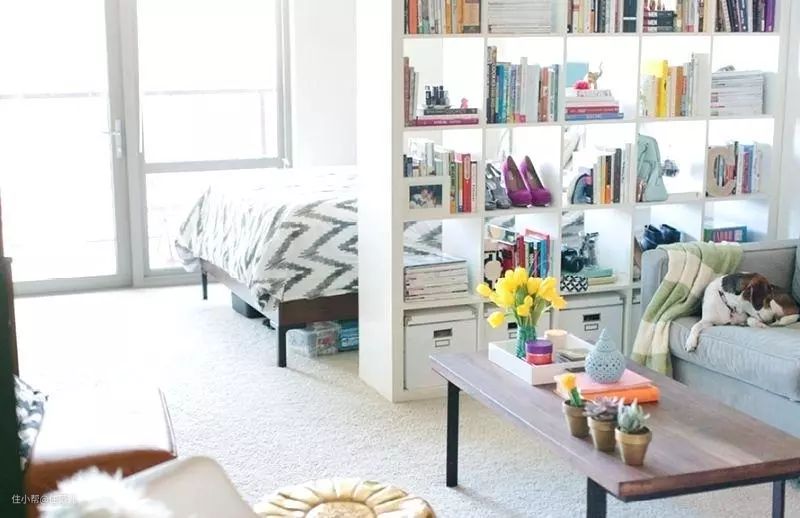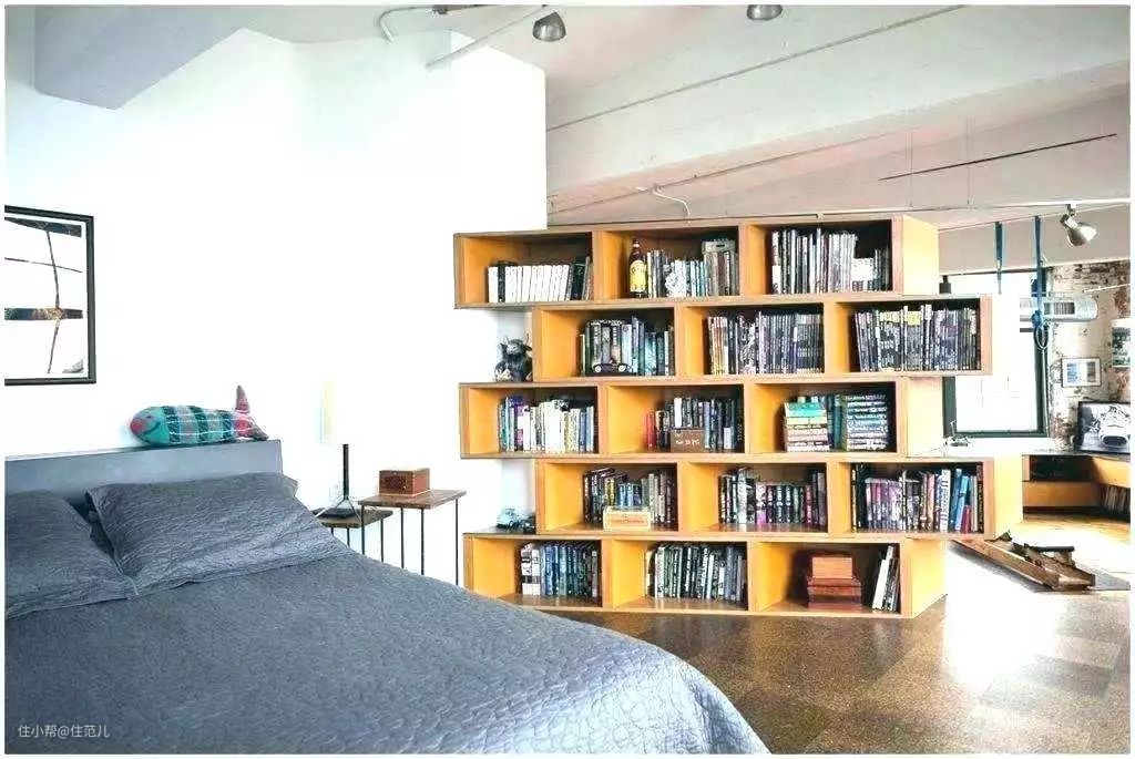 对于租房党来说,大开间一览无余未免有些尴尬,用书柜分隔出卧室与客厅,既凸显了有趣的灵魂,又让出租房不那么单调。