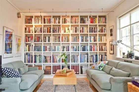 首先存书不足……其次普通长方形客厅设置一面墙的书架压迫感很强。