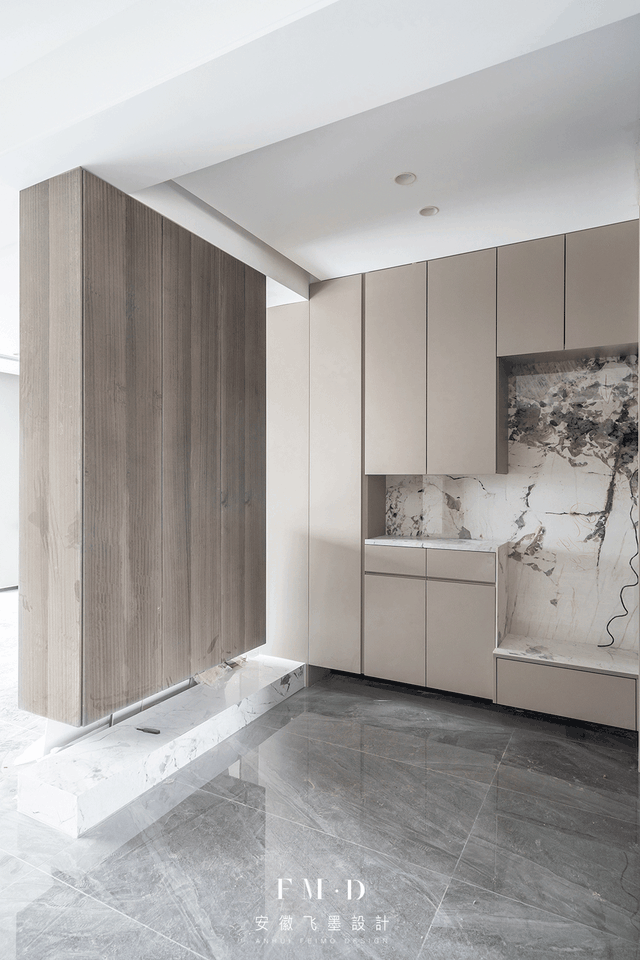 玄关柜中间留空小台面放置随手物品,右侧预留换鞋凳,坐着换鞋多舒服,底部还要记得悬空,避免一进屋就是满地鞋子的尴尬。