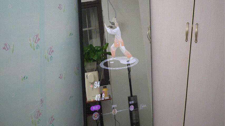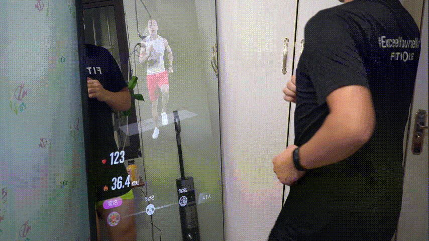 ▲即便从侧面有反光的情况下看,镜面显示仍然很清晰。镜面除了动态人像外,还有咕咚手环即时回传的心率数据、消耗的卡路里以及实时消耗卡路里排名。运动进行过程中,伴随着排名的变化,能激发用户的好胜心,从而更能坚持下去。