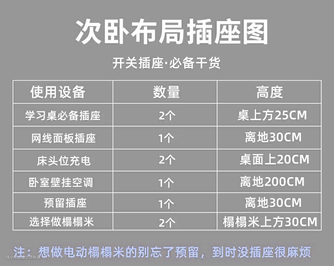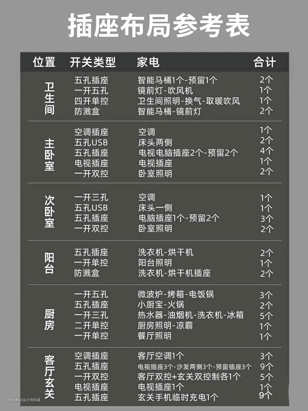 攻略按照使用率比较高的电器来进行插座的设置,大家可以参考参考,具体的数量还是需要根据自身的需求来调节,有不同意见或者需要补充的朋友们可以评论区留言和我讨论互动~