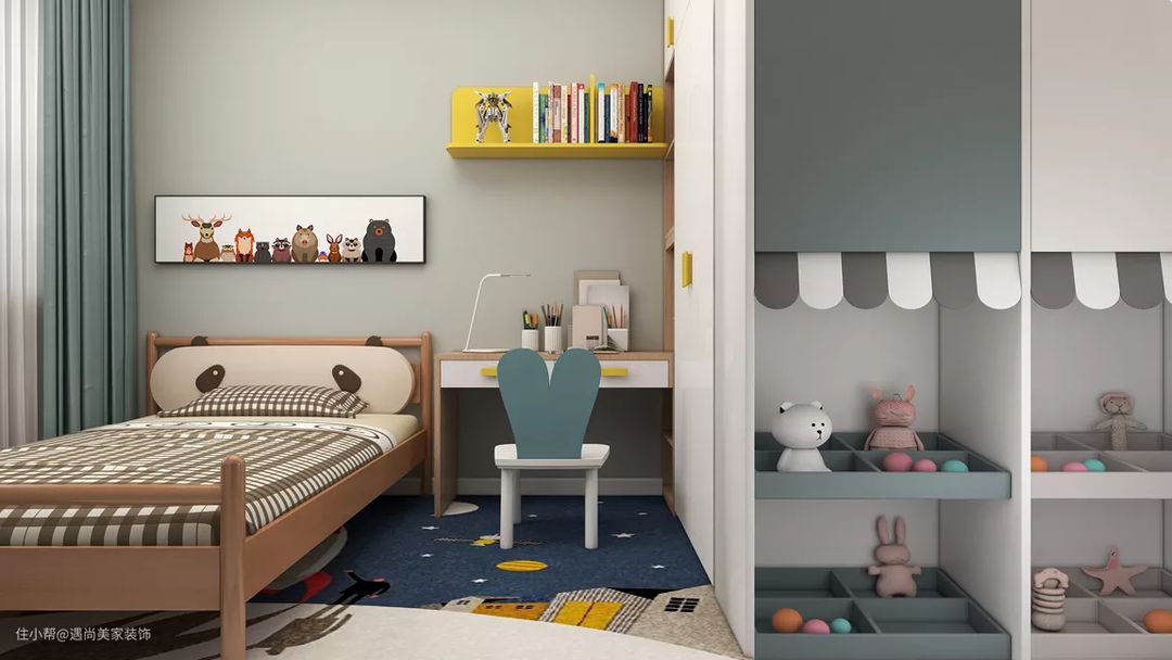 儿童房的设计可以说是改了又改,不仅有收纳柜还添加了玩具收纳。底层柜子是开放柜,方便小朋友拿取玩具,也能培养孩子良好的生活习惯。
