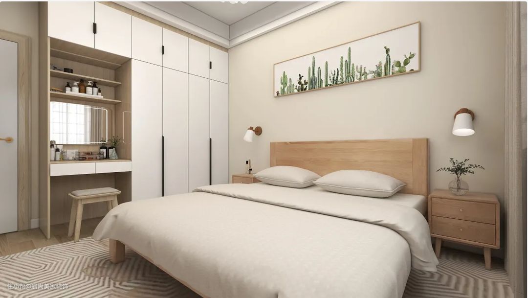 主卧延续了主题设计,整体同样是奶油白为主色调,原木家具点缀。因为业主需要一个梳妆台,于是借用两格的衣柜空间改造成了梳妆台。