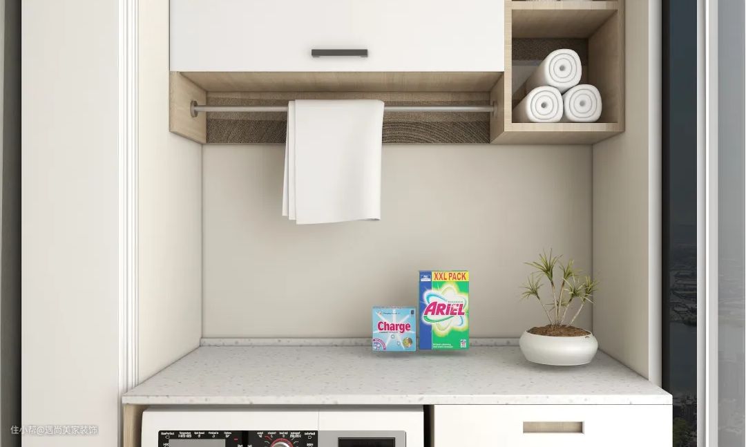 电视墙是用最简单的瓷白色,旁边打了开放式的收纳柜用于放书籍、花瓶、手办等小物件,可以算是一家三口的展示柜了。