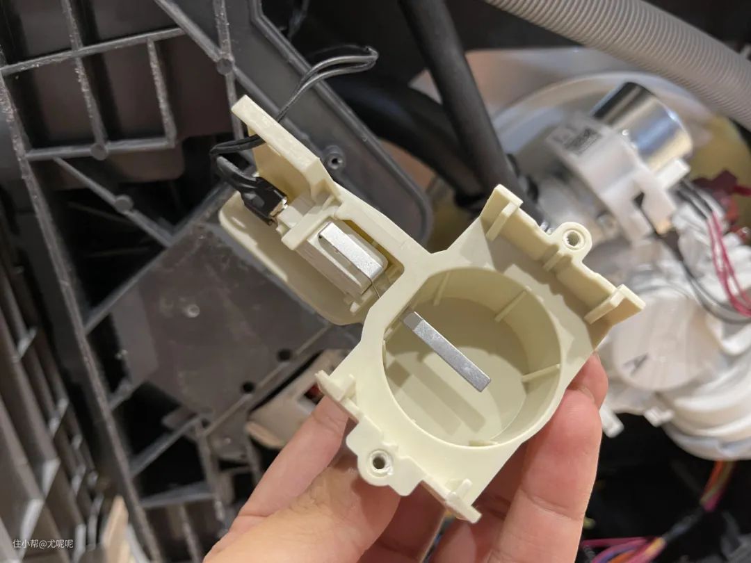 聊到这里我也就顺便和大家一起看看拆机后的洗碗机内部结构,首先主电机旁边这个是分水阀,它可以控制每一路水的通断。从而实现了水路的独立,只有这样才能更好的进行分层洗。