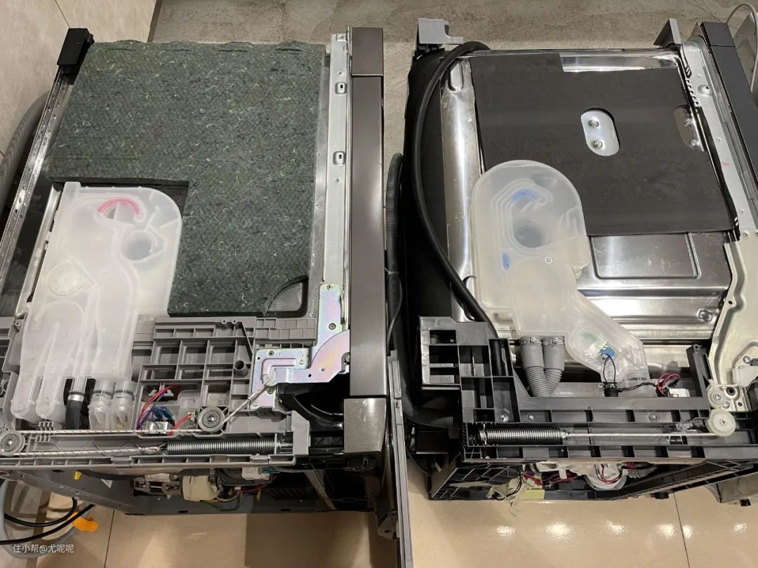 海尔和美的侧壁和底部是拼接的,容易藏污纳垢。不过同样拼接其实也有区别。海尔是全不锈钢内胆,而美的是底部采用的是塑料材质,并且可以看到美的水路是塑料材质漏在外部的,而海尔则采用了不锈钢一体隐藏式设计。