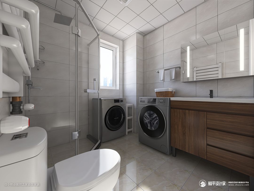 卫生间浴室柜安排了镜柜,照镜子的同时打开还能用作收纳,淋浴房起到干湿分离的作用,避免洗澡时水花四溅。