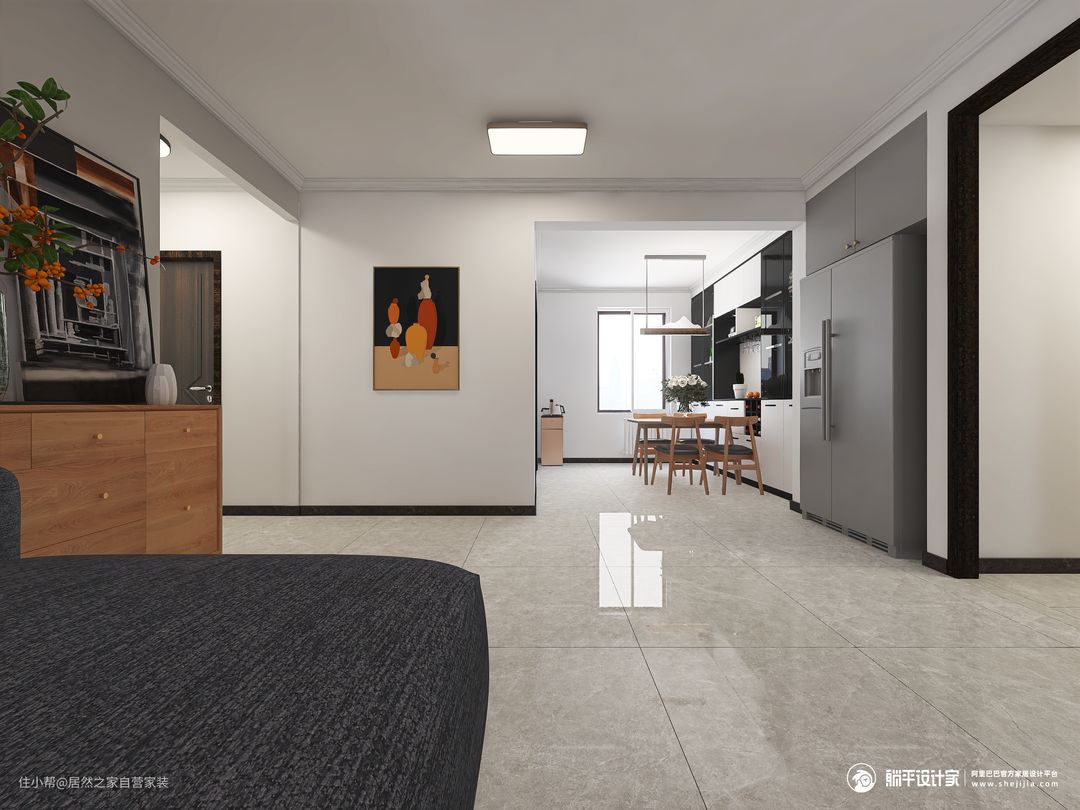 客餐厅一体扩大空间视野。餐厅安排内嵌冰箱,高级灰点亮空间。餐边柜收纳空间超足,日常餐具用品均可收纳起来,让空间干净整洁。