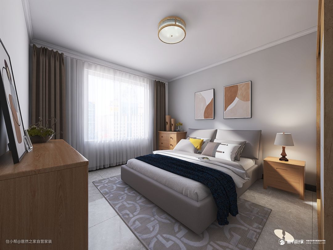 卧室通铺大地砖,看起来高级又大气,床头柜收纳空间足,且颜色与木门颜色呼应,突出了家具的色彩性。