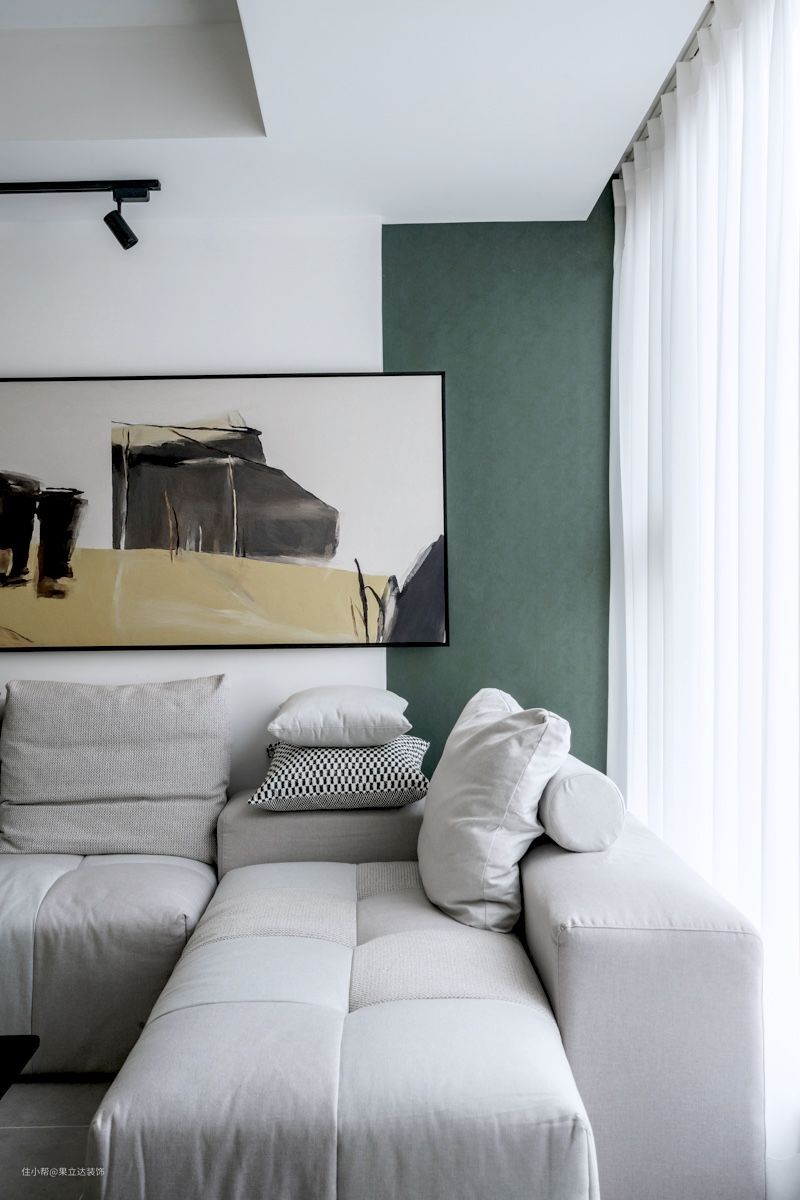 干净的白纱配上可以窝进去的暖色系麻布沙发,背景是墨绿色墙布和姜黄色挂画,浓淡相宜,倚靠在这里读书听音乐是多美好的生活。(墨绿色墙布位置是房屋结构的天然凹陷)
