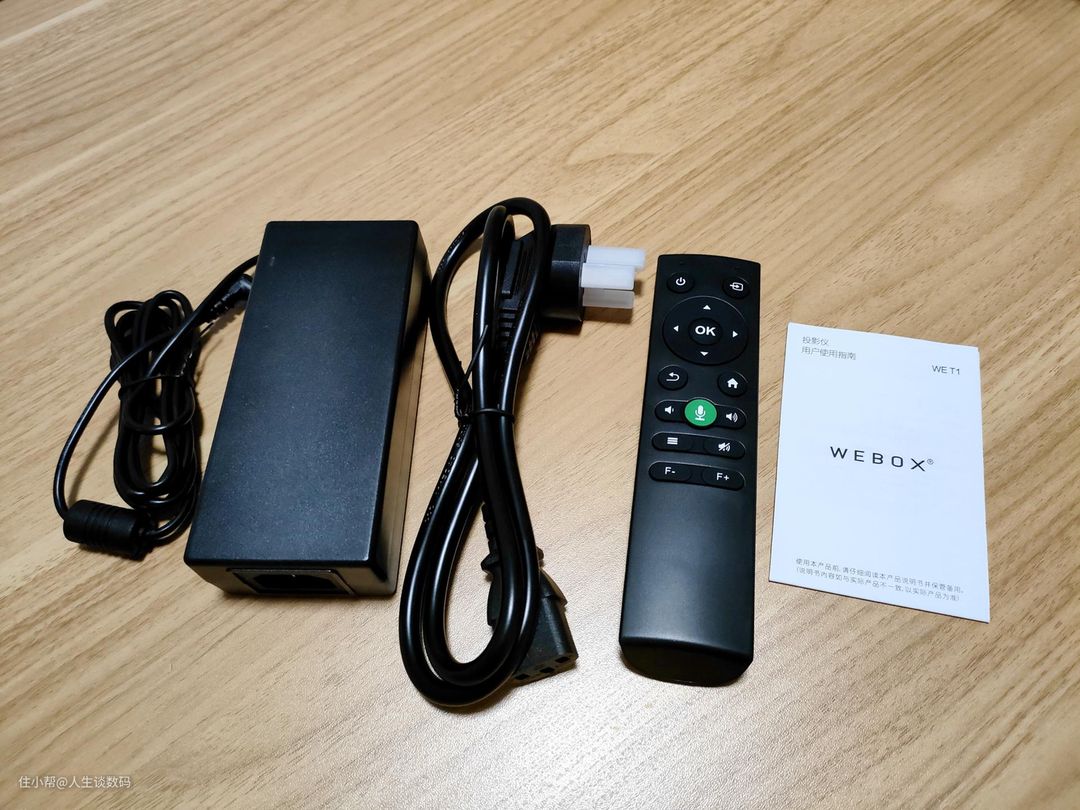 除了投影仪主机,在配件上还包含电源适配器、专属蓝牙遥控器以及产品说明书组成。比较贴心的是遥控器还附带了两节7号电池,基本上到手就可以很方便地使用。