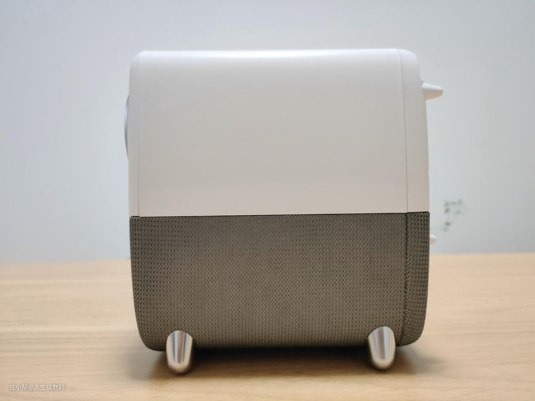 与市面上大部分便携式投影相比,泰捷WEBOX T1体积稍微偏大一点,当然作为一款家用投影仪来说,其便携程度也十分不错。投影仪底部采用了银色的四腿支撑,有效增加的接地距离,在散热表现上不用多说。