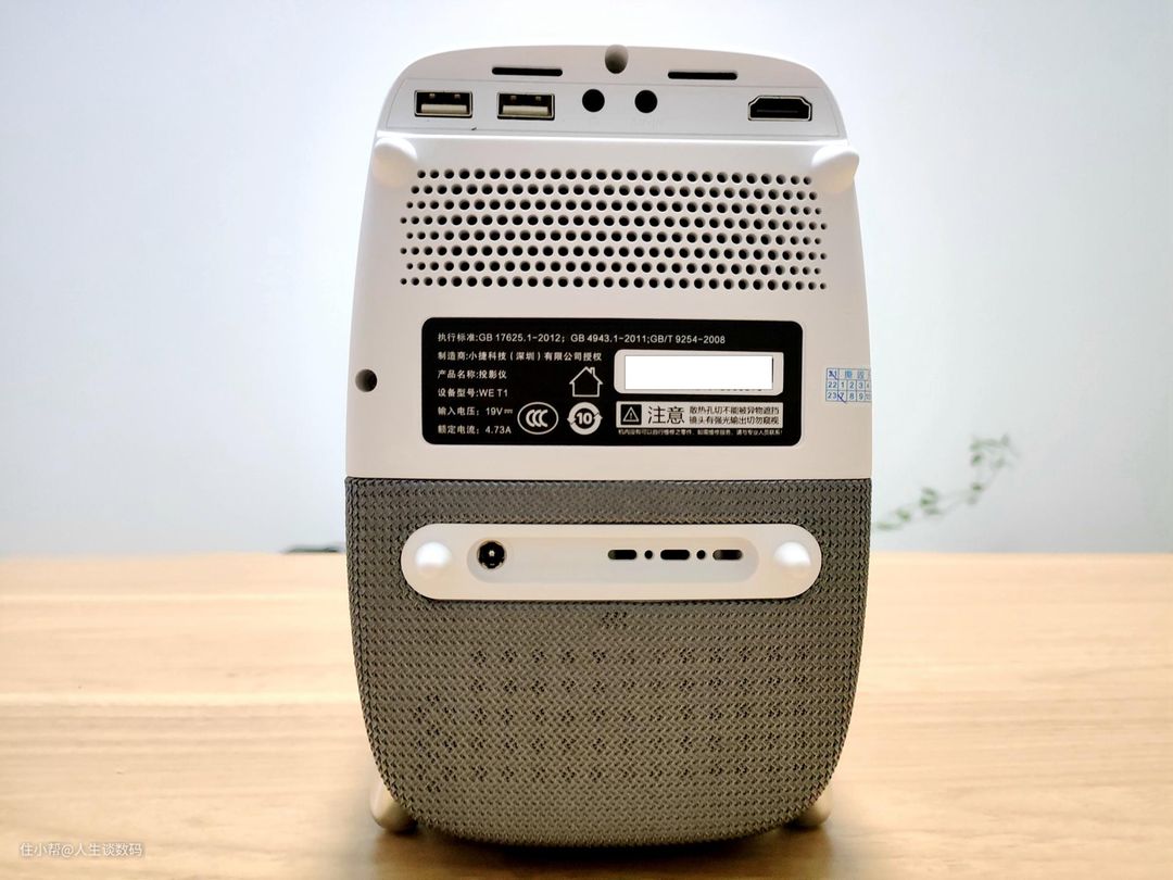 值得一提的是,在接口方面泰捷WEBOX T1还是相当丰富的,USB接口、耳机接口、AV-IN接口和HDMI接口、电源接口等一应俱全,除了投影自带的资源,基于丰富的接口加持,使用时也可以轻松的接入各种设备,比如U盘、移动硬盘、笔记本以及电视盒子等设备,设备扩展能力值得称赞。另外,细心的小伙伴儿可以发现在接口面还有四个突出的白色触角设计,这样设计最大的优势就是当投影仪靠墙摆放使用时,通过四个触角可以有效保证靠墙距离,从而提升散热能力。