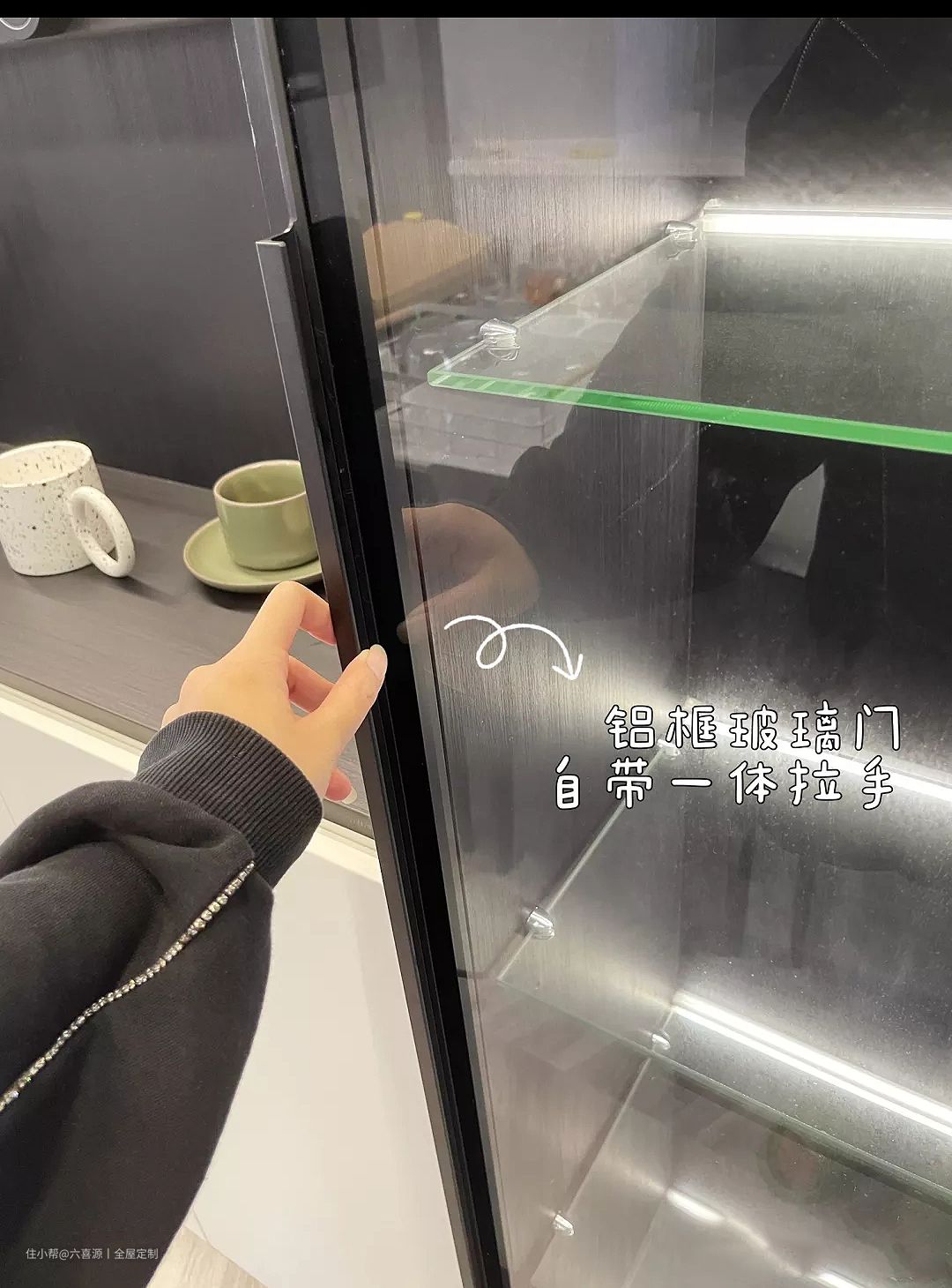 图6:玻璃本身自带铝框,一体长拉手,颜色与柜子很协调,所以也很好看