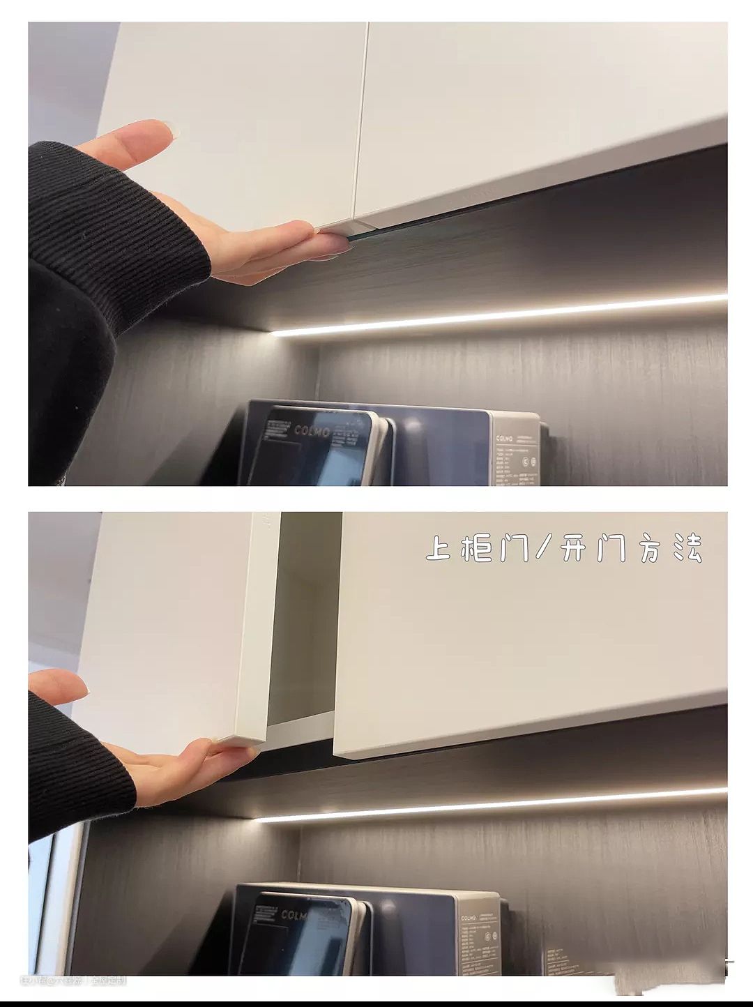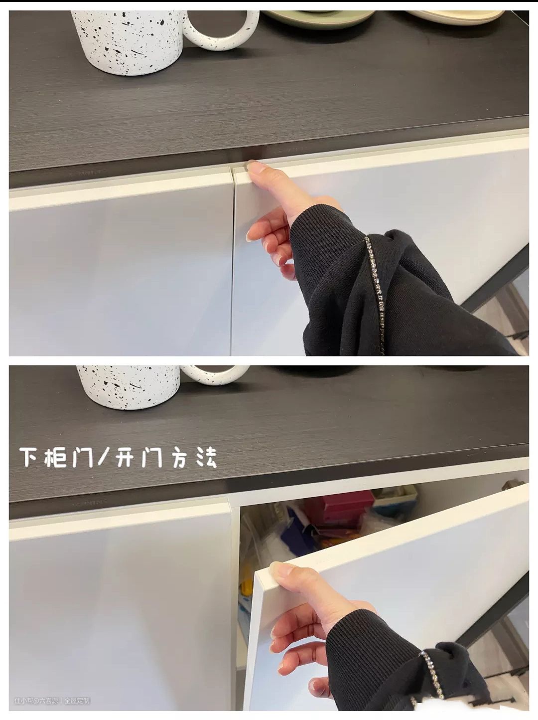 业主不喜欢小拉手,影响柜子颜值,又很讨厌反弹器使用感,所以执着要求现在的方案。无拉手设计真的大方又好看。开门方法如图4、5