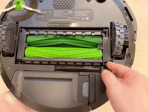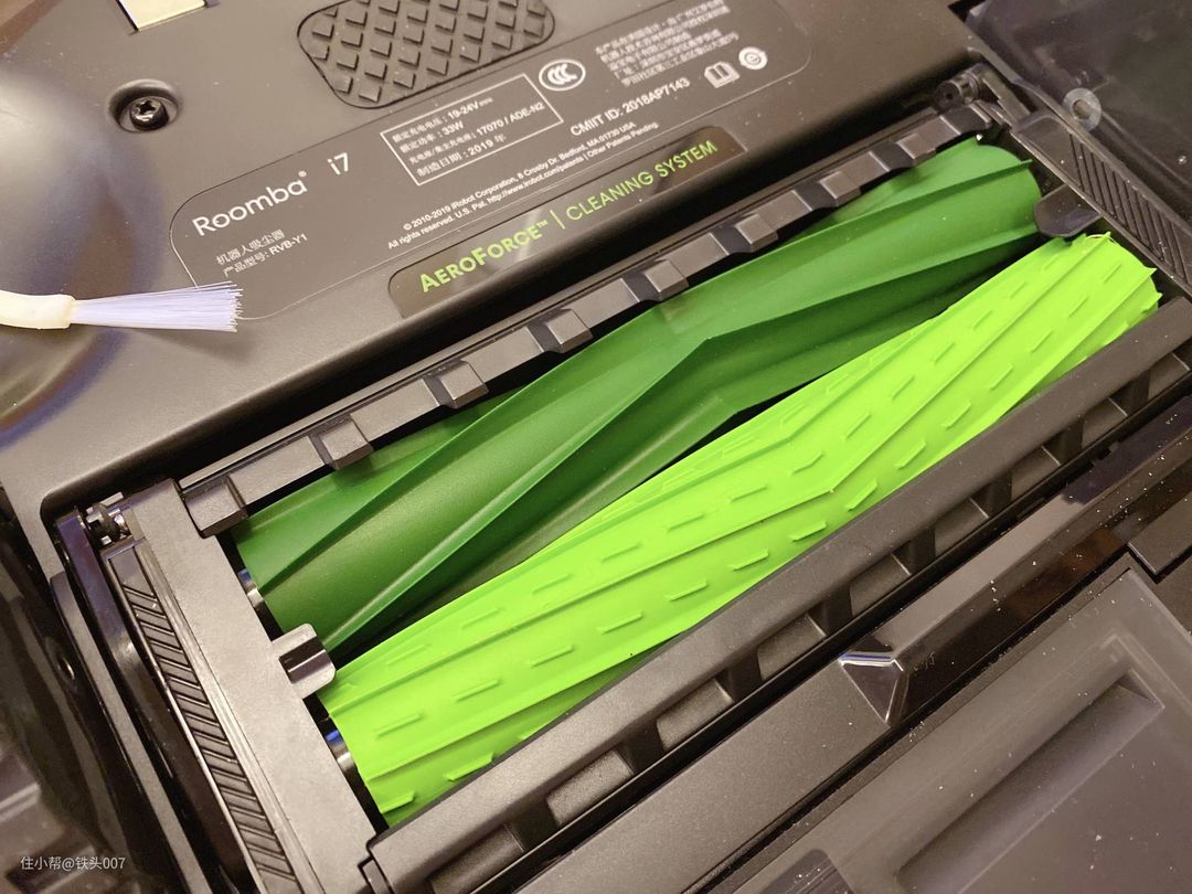 ▲Roomba i7+ 扫地机器人背面可以看到采用了相向转动的双效组合胶刷和一个边刷来作为主要的清扫工具,边刷主要是将地面上的垃圾从四周扫到吸风口下,然后通过胶刷吸入垃圾,达到高效清洁效果。