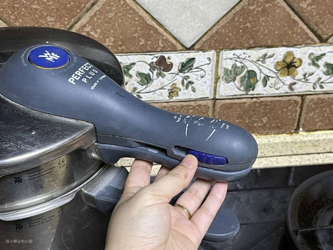 现在的高压锅不论燃气还是电的几乎都有安全锁的设计,不泄压无法开盖,可以有效的杜绝人为的暴力开盖滚烫的食材喷发烫伤等安全隐患。像下图这个WMF的燃气压力锅直接有个安全锁扣,锁上才能加热,开盖必须开锁扣,而不泄压是无法开锁扣的