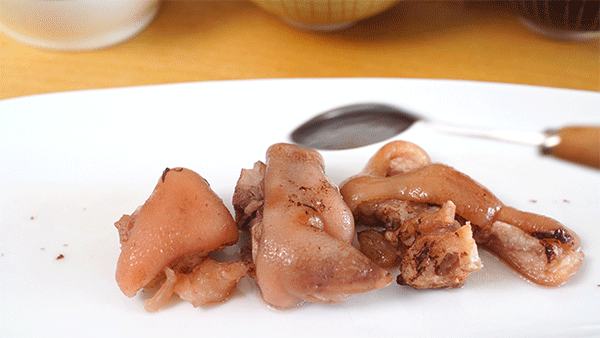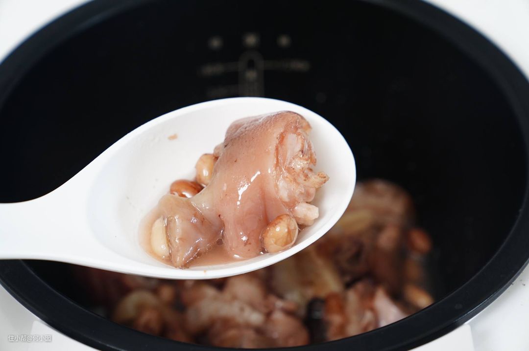 这样可能看不清楚,看这个动图吧,米家1S的这一份猪蹄是完全不烂,跟没炖差不多,另外两份,大宇和九阳的猪蹄都炖得很烂,花生也很烂了