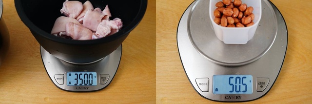 首先我们还是把分量相同的猪蹄,加上分量相同的水,加上分量相同的花生,都分别称量好