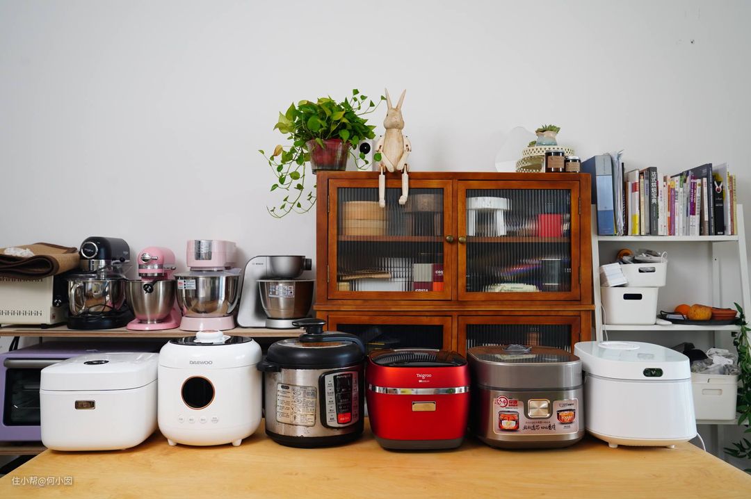 当当当,来个手上的电压力锅和电饭煲的合影吧,桌子1.8m的差点就摆不下了,从左到右分别是米家1S,大宇,九阳,钛古,苏泊尔和云米一共六个锅