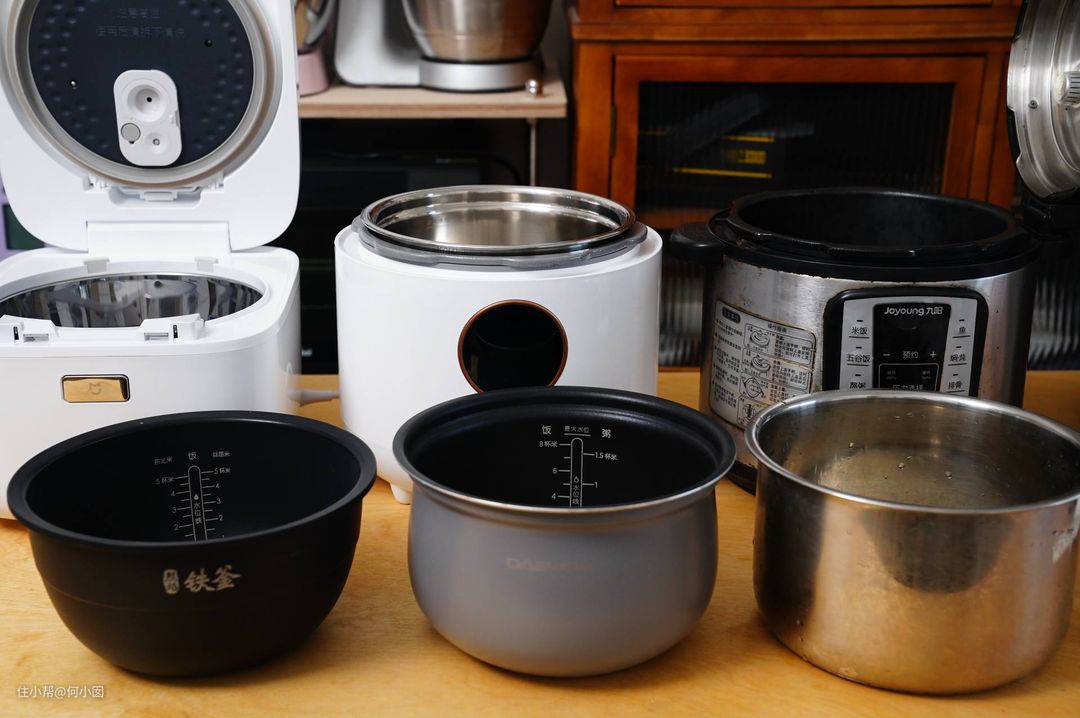 这里面九阳是纯电压力锅,大宇是电压力锅和电饭煲两用锅,米家1S和钛古是带微压的电饭煲,苏泊尔是带远红外加热的电饭煲,云米是球釜电饭煲,今天就借新入手的钛古电饭煲和大宇两用锅的机会跟大家来聊聊关于家庭选购压力锅那些事儿