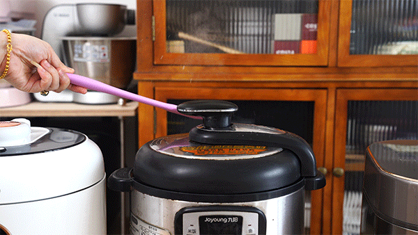 而这种九阳限压阀可以手动泄压,但是不能直接上手,否则会被烫伤,只能用一个长筷子或者长锅铲去拨开限压阀泄压