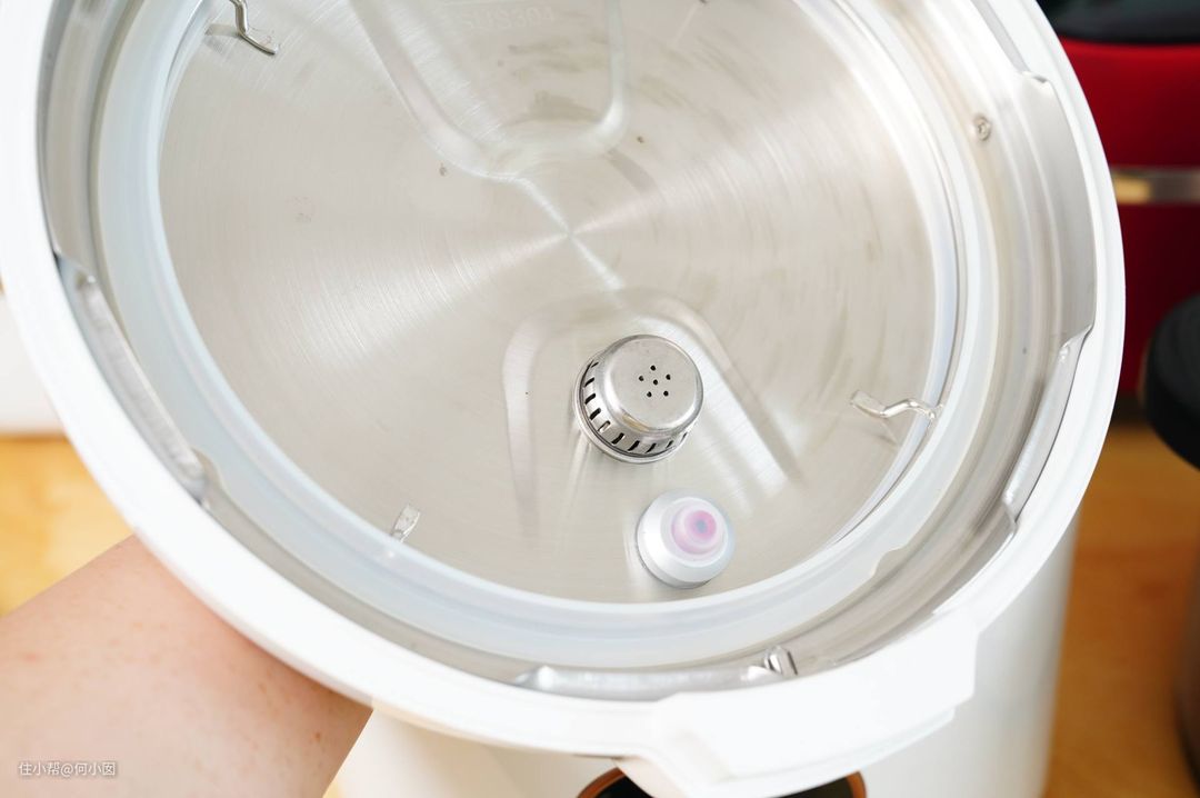 很明显现在的防堵罩除了侧面有排气孔,底部也有排气孔,能充分的保证不会被沸腾的食材全部阻塞,造成压力过大的安全隐患,在选购电压力锅的时候,需要留意细节特写图,防堵罩要有足够的气孔防堵,否则会有严重的安全隐患