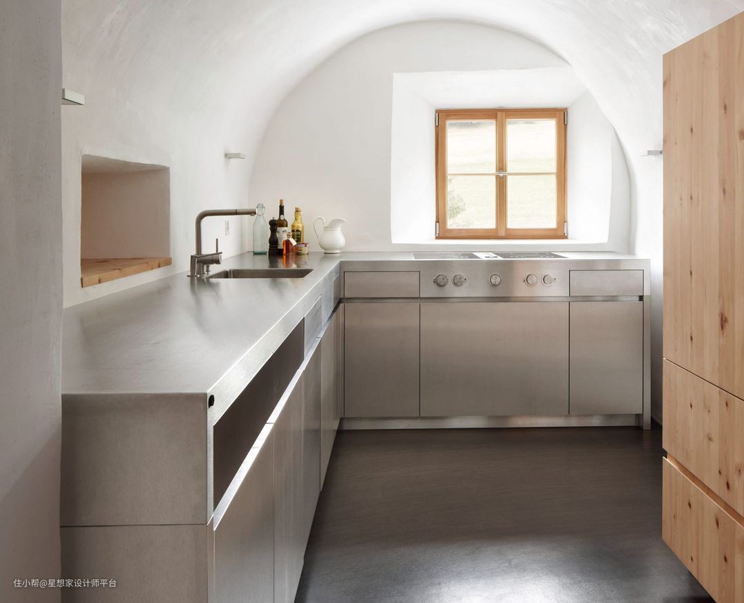 U形厨房由三个工作台组成,连接成一个开放的矩形。