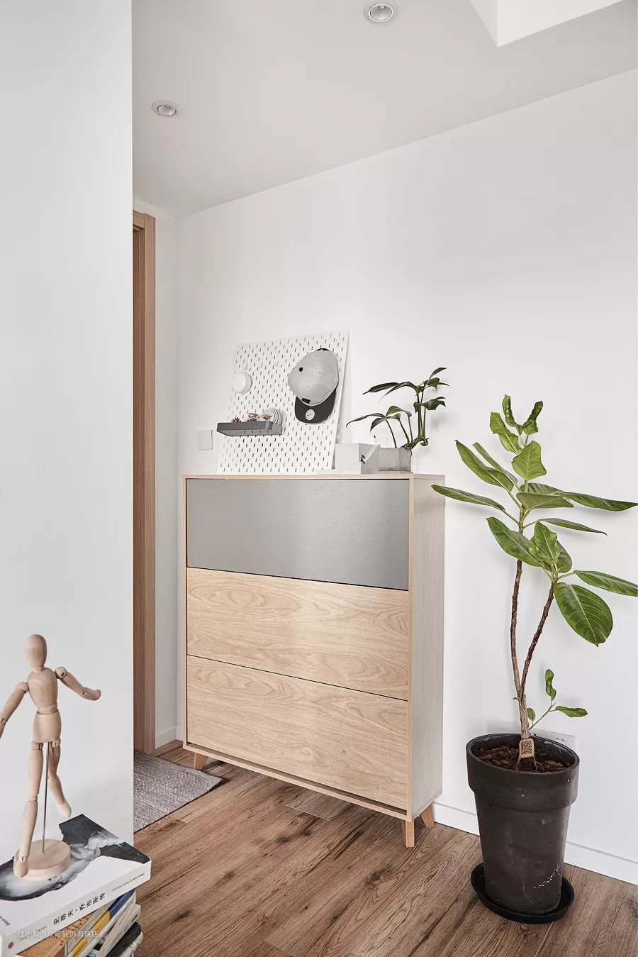 在门旁横向放置鞋柜,脚凳,将玄关设置为在客厅的空间一部分,但是有明确的制作了玄关的规划,仪式感满满!!