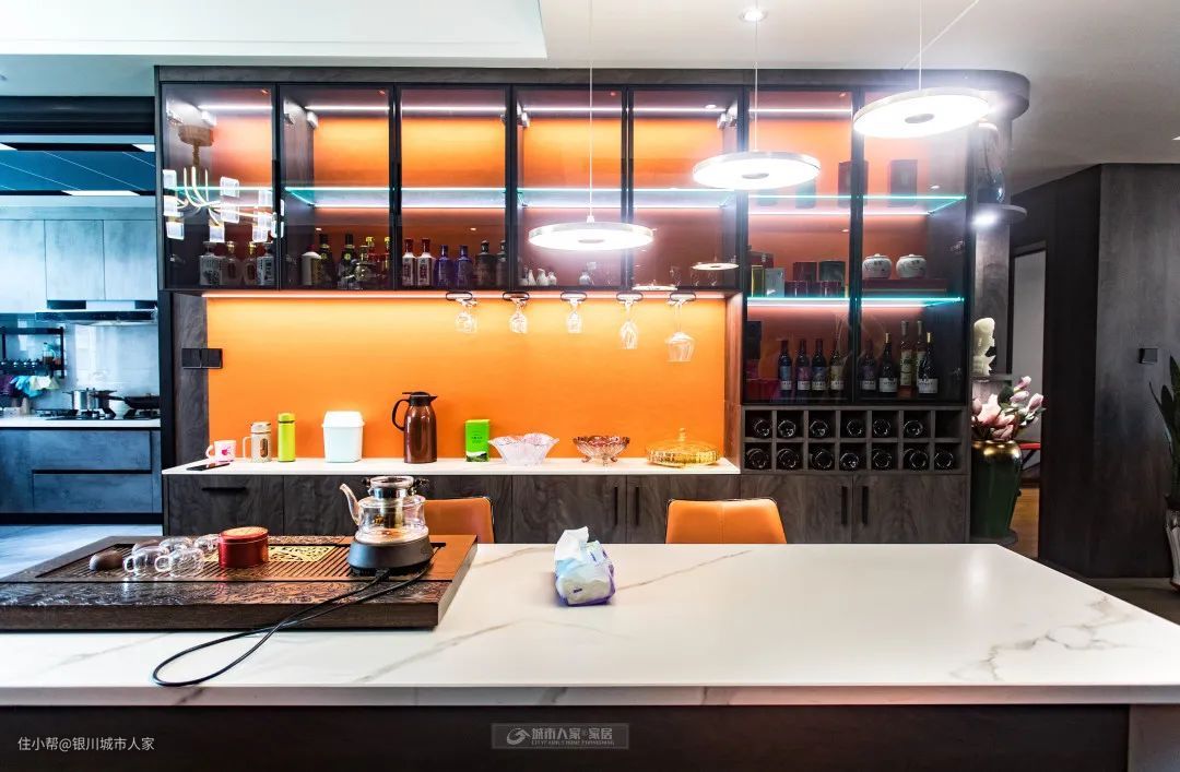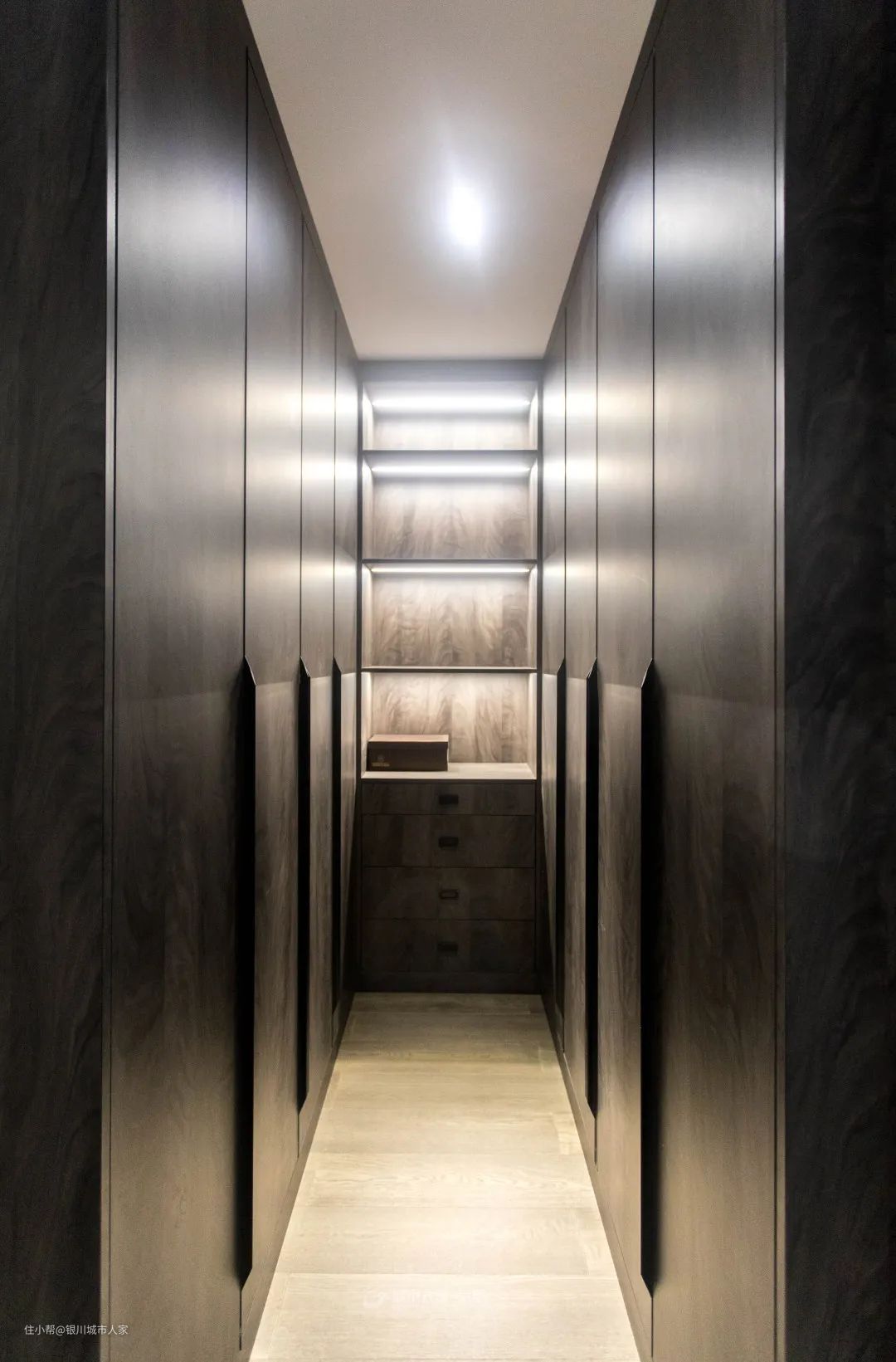胡桃木色颜色沉稳低调,很多人会觉得沉闷老气,但搭配上明亮的灯光和木地板,立马让空间变得优雅大气起来,凸显出主人的品质要求,精致、优雅。