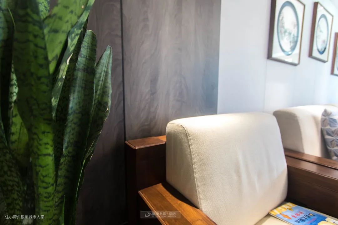 整体家装统一协调,胡桃木色作为主色调,木质家居有一种自然清新的独特感,而黑胡桃木系列的家居,给人以古朴又自然的深沉,加上好看与空间氛围协调的绿植装饰,使客厅变得更加清新明媚。
