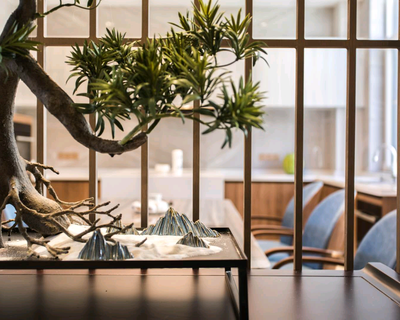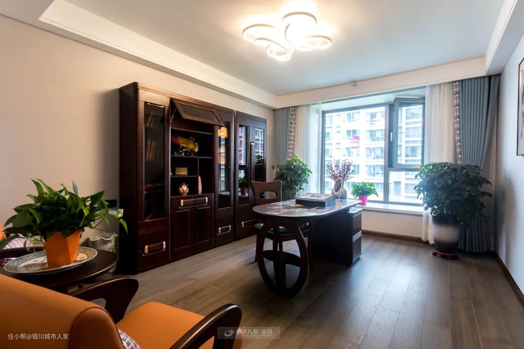 中式书柜将现代元素和传统元素结合一起,既有东方的文人气息,又有现代的时尚感,绿植的点缀,让整个书房环保又健康。