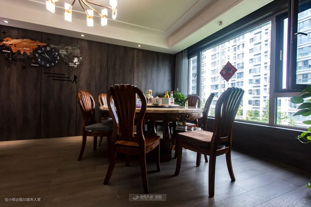 餐厅摆放大型的圆桌,增加用餐位,圆桌与餐椅依旧选择了沉稳低调的胡桃木,与灰色窗帘色彩协调搭配融洽,吊灯造型设计别致颇具古风感,周围的绿植抒写悠然意境,让自然情趣在空间自然弥漫。