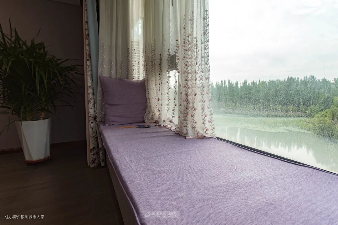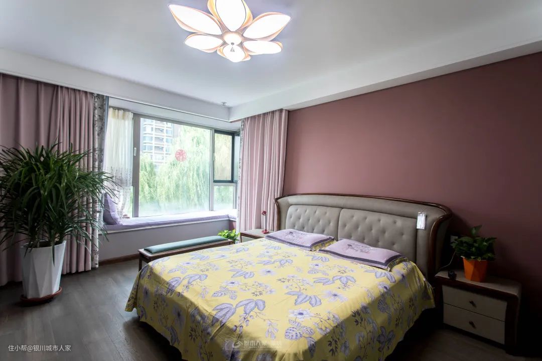主卧没有传统中式的繁复和雕刻,简化了古典中式的厚重感,整体以沉稳、优雅的气质将文化的韵味展示出来,内敛但不老气。天然、柔软的质感、模糊渐变的颜色,屋内的胡桃木相呼应,看起来才温馨亲切。